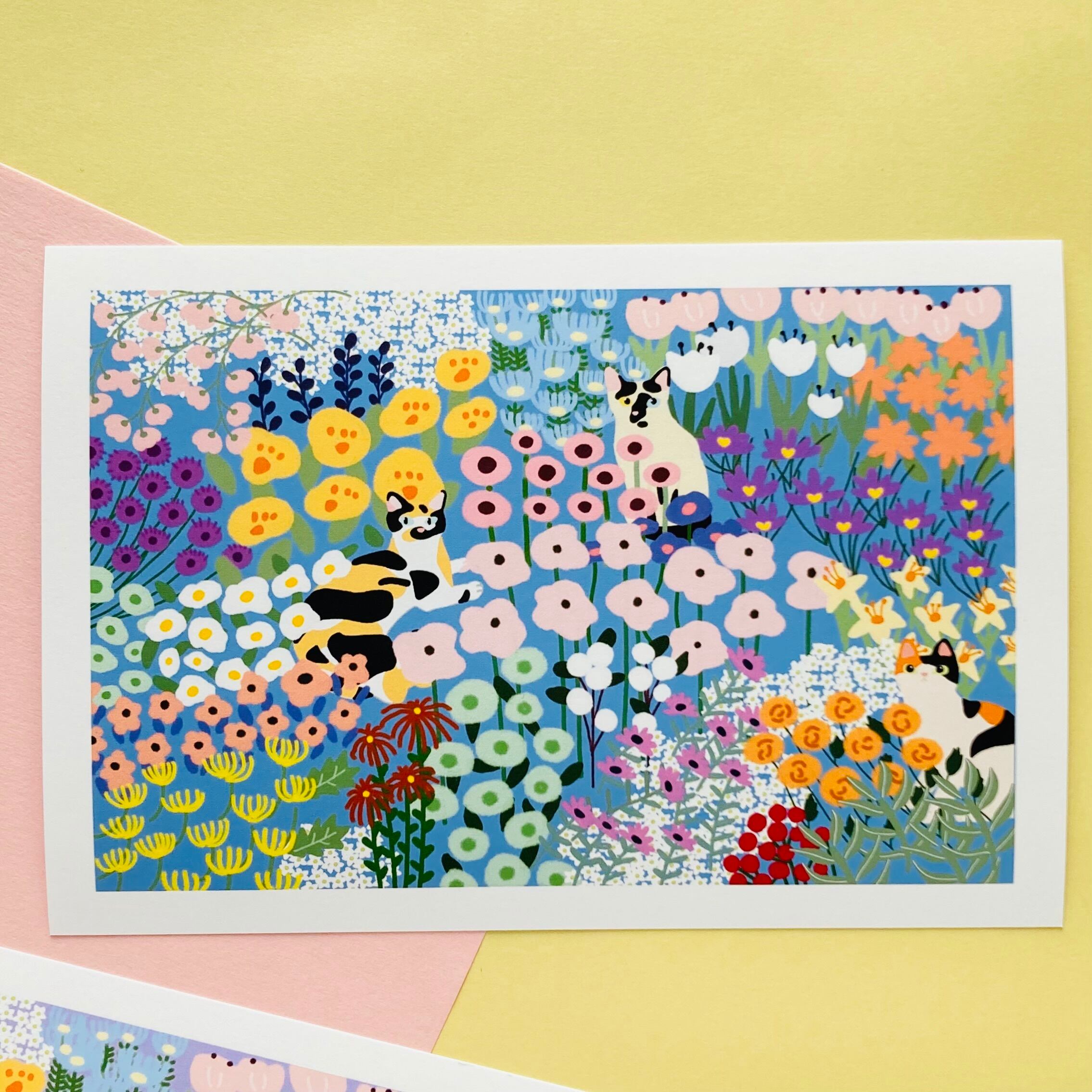 猫たちはうちの庭を横切って行った子たちがモデルです。まるで「私が一番!」とでも言うように、さまざまなポーズでアピールしていく姿があまりにも可愛くて、ポストカードにしました。
