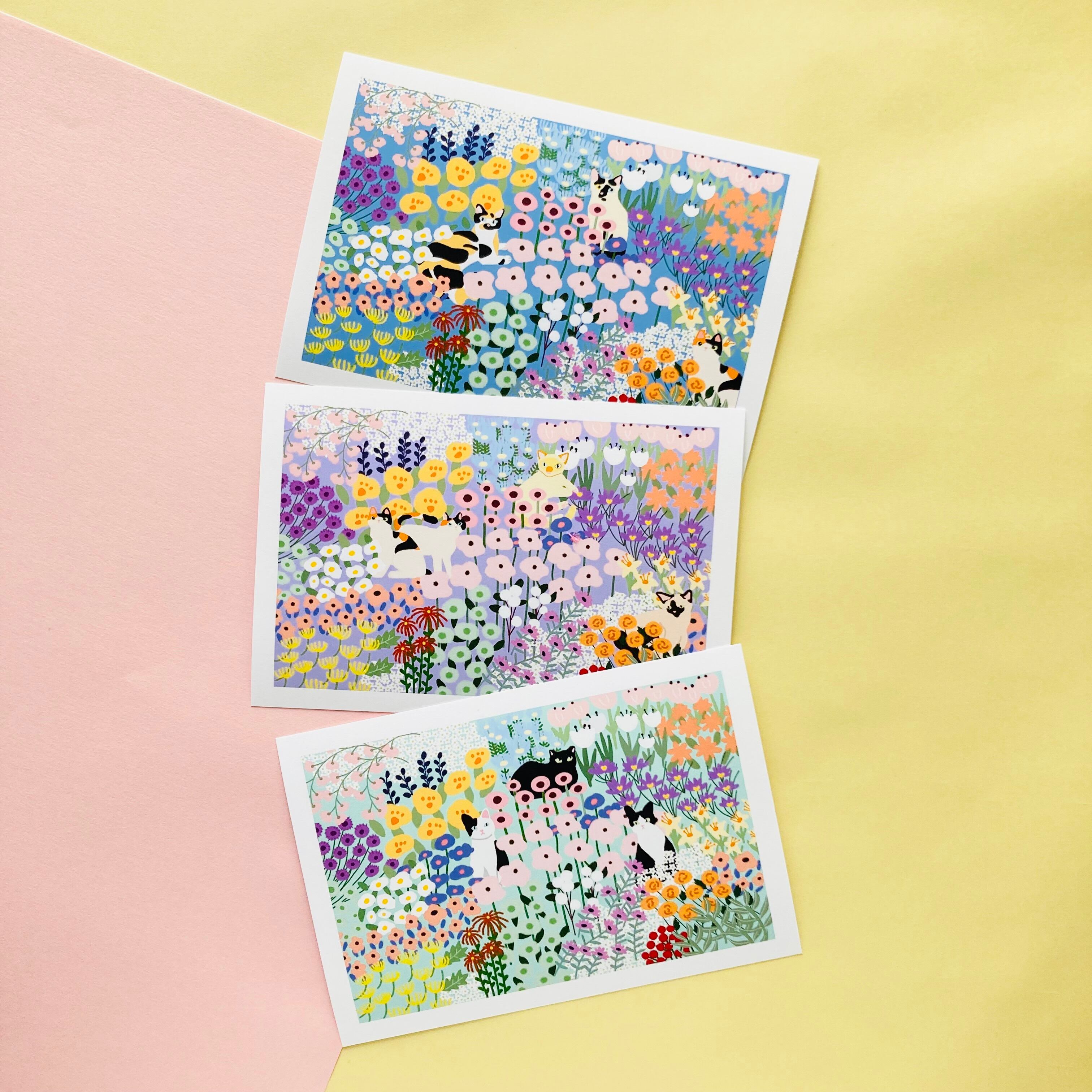 3種類ありますが、全てのカードで猫の種類と位置が異なる、遊び心満載の作品になっています。